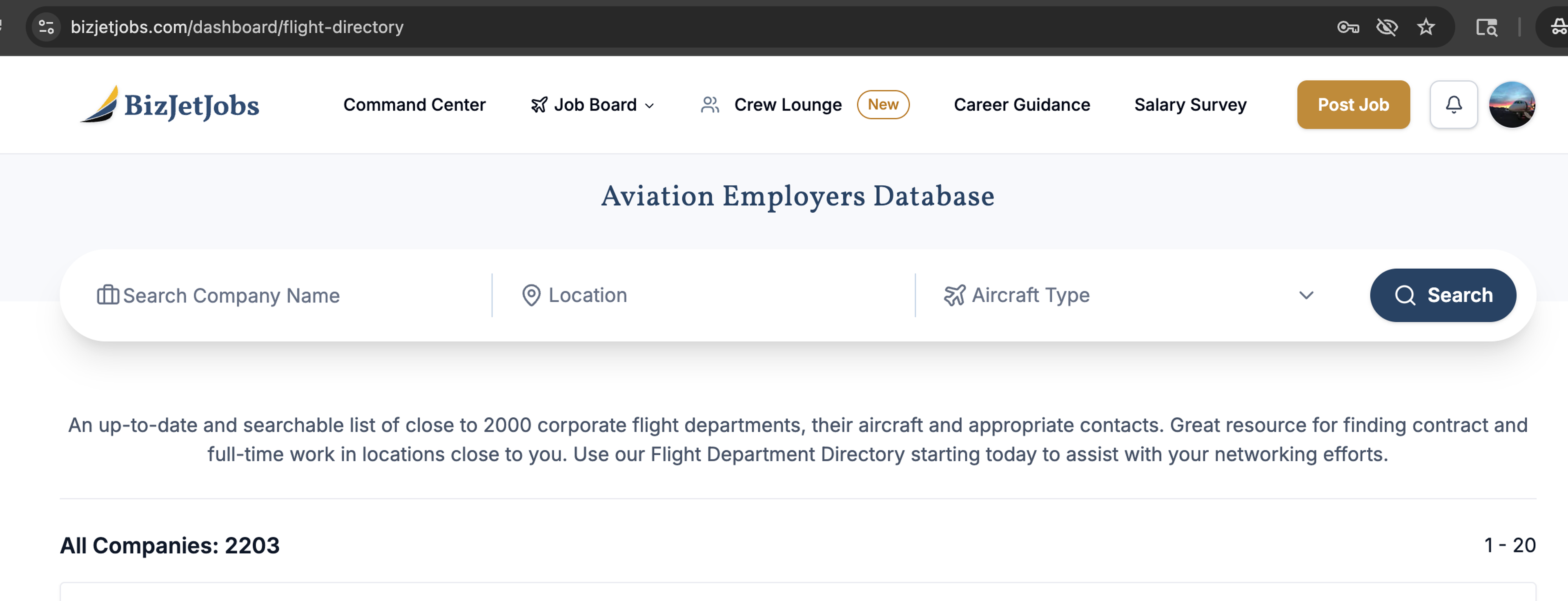 If you read no further, we need you to know as a low-time pilot, if you’d like to be gainfully employed in aviation with a flying job, “networking” is now your middle name. We’re providing a list of five ideal jobs for you as a low-time pilot below. But to get any of these jobs, the onus is on you. Use your networking skills. Become an investigator. Many times, companies like these won’t publicly advertise their jobs. You need to research companies and aviation departments in your area that do this type of flying. Then, be there, network and monitor those companies. Did you know Bizjetjobs.com members have access to a corporate aviation employers database that you can use to look up corporate flight department contact information and reach out to these corporate flight departments? (see below)