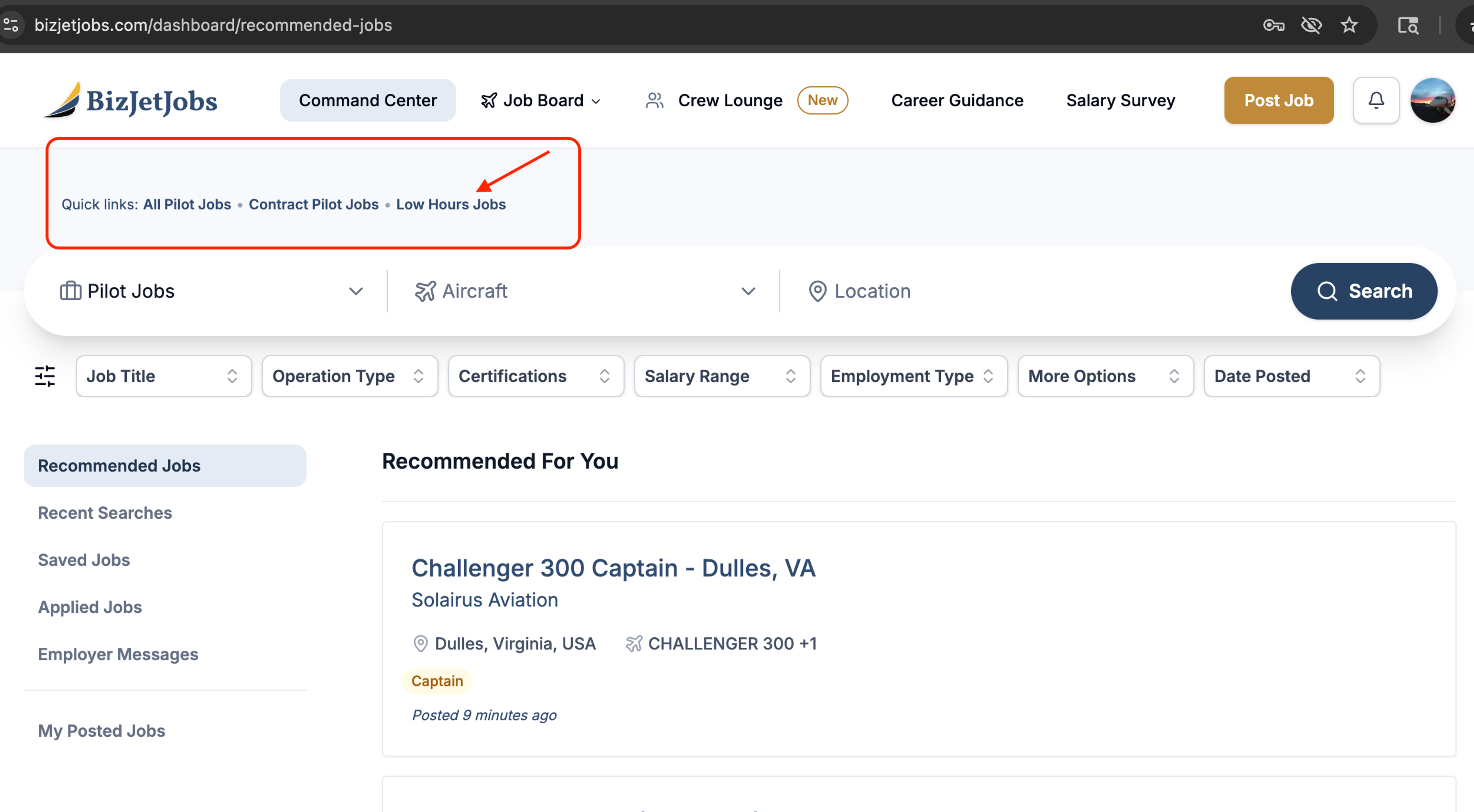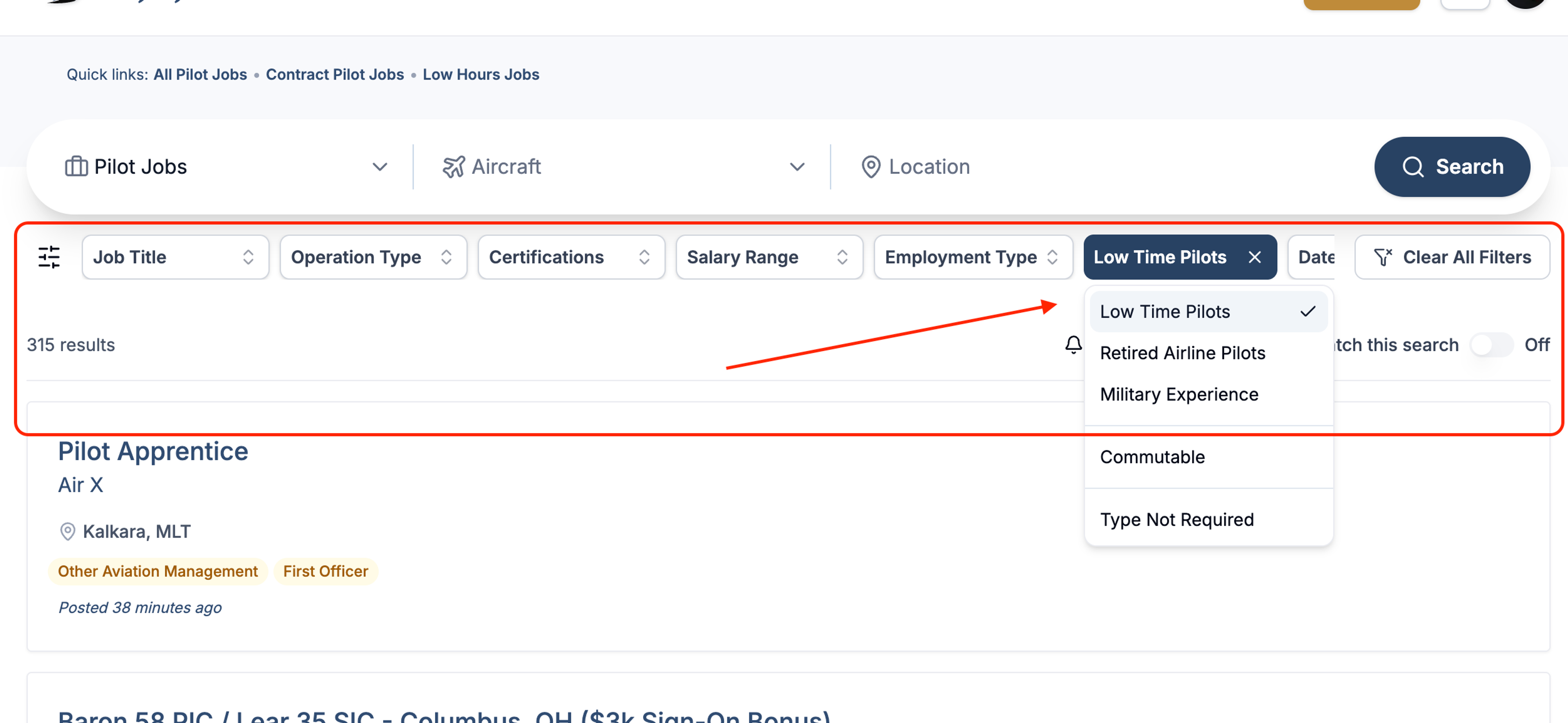 To find all low-time pilot jobs on our job board, navigate to quick link as shown here:
